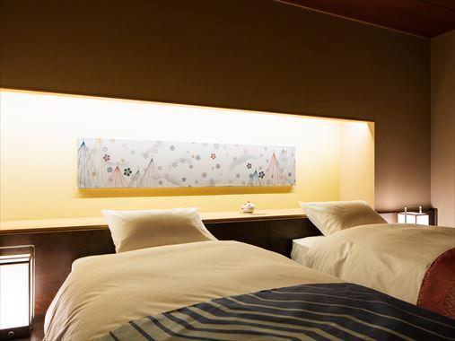 旅館從住宿到餐飲,隨處可見加賀的傳統文化。客房裡裝飾著加賀水引(繩結)和加賀友禪(染布),料理以多彩繽紛的九谷燒盛裝。夜晚,還能在大廳欣賞震撼力十足的加賀獅子舞。