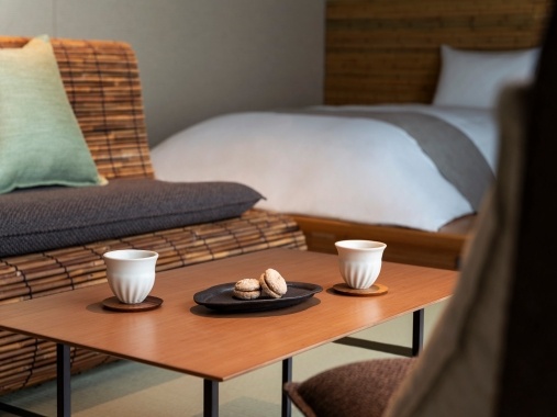 洋溢著地區特色,界的「當地特色客房」。「螢火籠照明」以栽種於日本國東半島且十分稀有的「七島藺」編織而成,是界 由布院「螢火籠客房」的最大特色。輕柔幽微的燈光,宛如初夏夜晚水邊閃爍飛舞的螢火蟲。